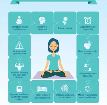 Meditation boosts energy, reduces stress, improves focus, and enhances emotional stability. It lowers blood pressure, strengthens immunity, and fosters self-awareness and harmony. A few minutes daily can transform your mind, body, and life.